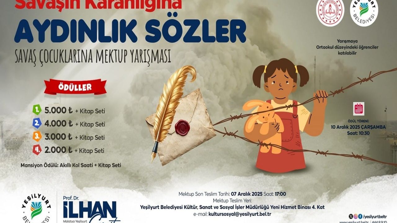 Yeşilyurt Belediyesi ile Yeşilyurt İlçe Milli Eğitim Müdürlüğü, '20 Kasım Dünya Çocuk Hakları Günü' ve '10 Aralık Dünya İnsan Hakları Günü' etkinlikleri kapsamında; "Savaşın Karanlığına Aydınlık Sözler" temalı savaş çocuklarına mektup yarışması düzenliyor.