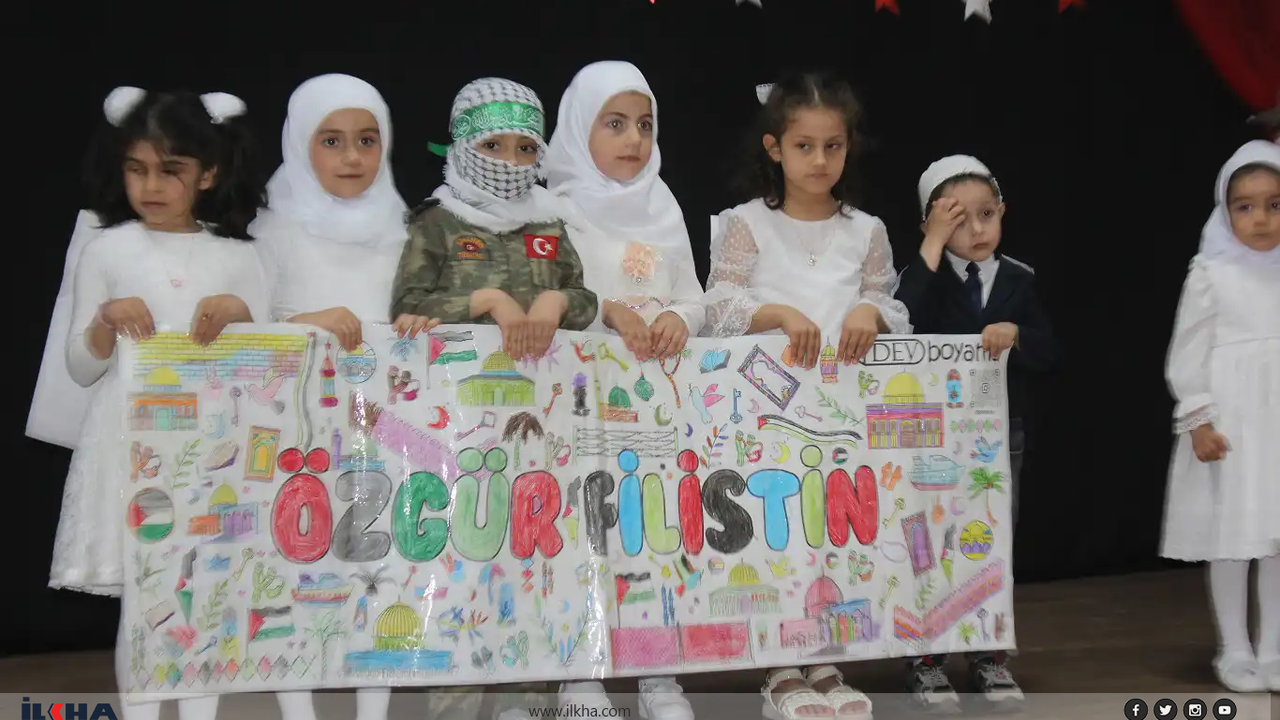 Ebu Ubeyde tasviri ile sahne alan çocuk ve Filistin temalı gösteri anında ise duygulu anlar yaşandı. (İLKHA)