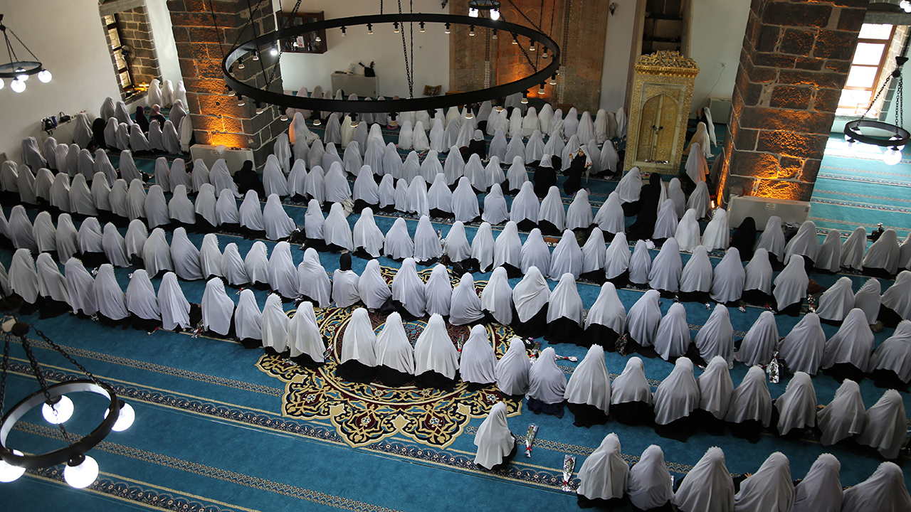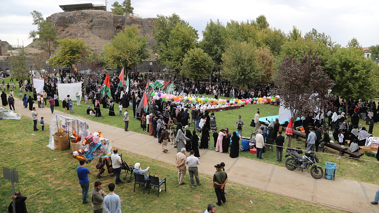 Diyarbakır merkez Sur ilçesi Kurşunlu camiinde namaz kılan katılımcılar, ardından Hazreti Süleyman Yerleşkesi'ne doğru yürüyerek burada kendileri için hazırlanan alanda yerlerini aldı.