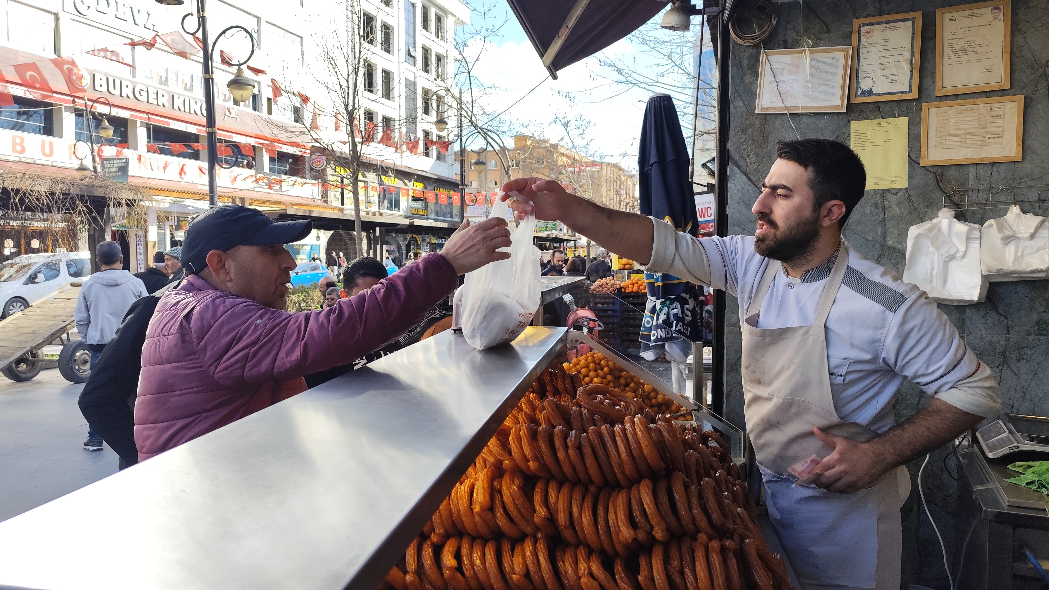 Bunun yanı sıra, taze taze kızartılan halka tatlılar da altın sarısı görüntüsüyle dikkat çekiyor. Şerbetli tatlı kokusu tarihi sokaklara yayılırken, birçok kişi iftar sonrası tatlı ihtiyacını karşılamak için bu tezgâhları tercih ediyor.