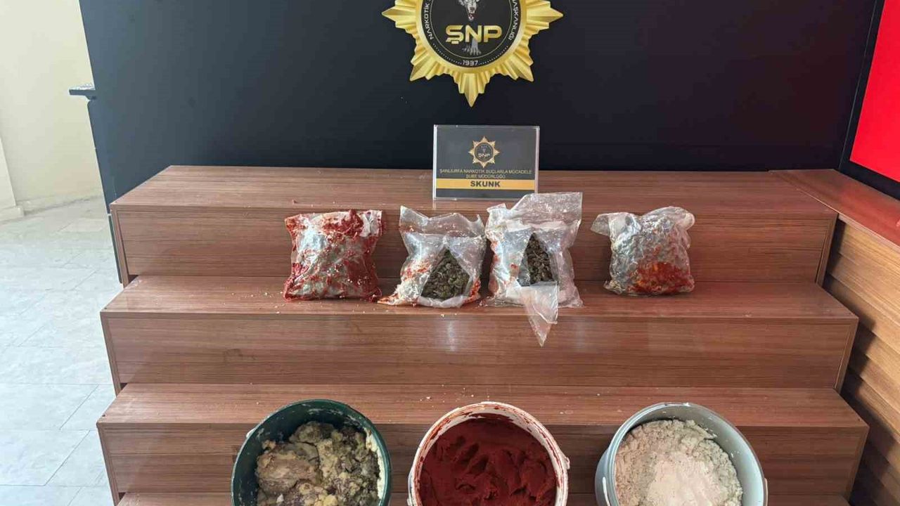 Şanlıurfa İl Emniyet Müdürlüğü Narkotik Suçlarla Mücadele Şube Müdürlüğü ekiplerince düzenlenen operasyonda, bir araçta yapılan aramada salça ve peynir kovaları içine gizlenmiş 4 parça halinde 2 kilo 400 gram skunk ele geçirildi.