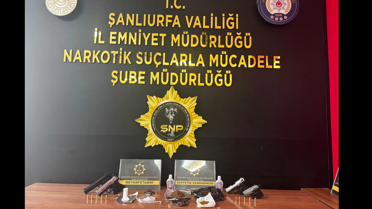 Operasyonda 2 parça halinde 14,36 gram metamfetamin, 4 parça halinde 63,90 gram sentetik kannabinoid, 90 gram aseton içeren 2 plastik şişe, 1 hassas terazi, 5 ruhsatsız tabanca ve 75 adet fişek bulundu.