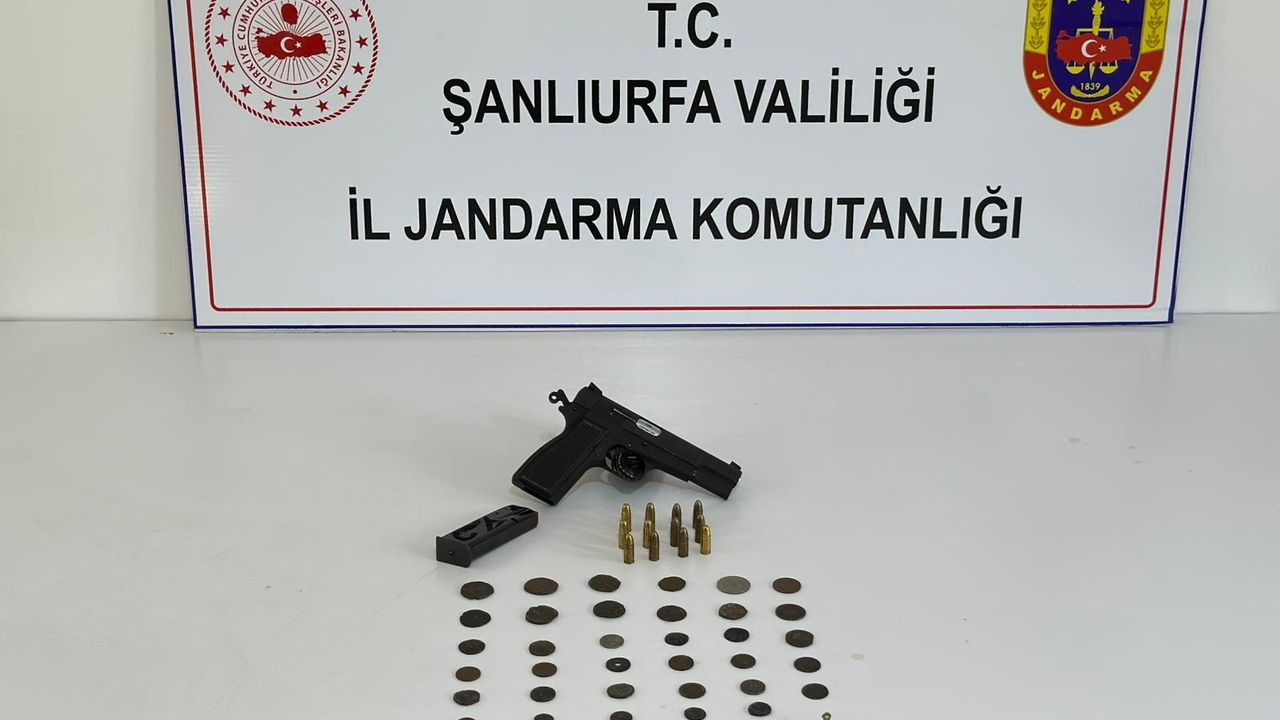 İlçe Jandarma Komutanlığı ekiplerinin de katılımıyla adreste yapılan aramada, Roma ve Helenistik döneme ait olduğu değerlendirilen 40 sikke ile 1 damga, 1 tabanca, 12 mermi ve şarjör ele geçirildi.