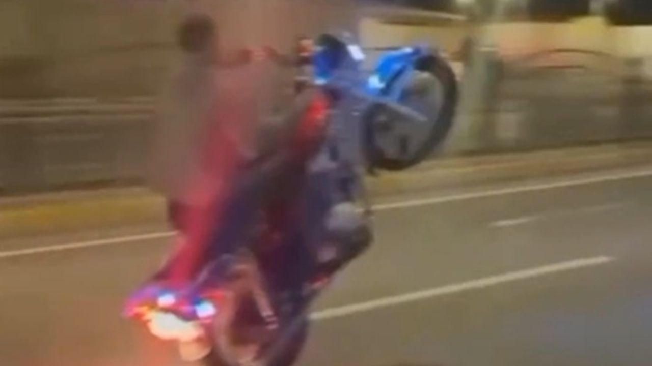 Paylaşılan görüntülerde bir gencin, caddede akan trafiğe aldırış etmeden motosikletin ön tekerini kaldırarak ilerlediği görülüyor.