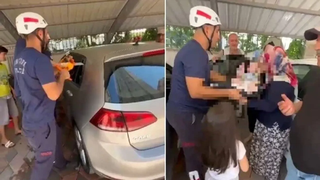 Otomobilin ön kısmında bebek koltuğunda oturan 3 aylık Nisa bebek mahsur kaldı.