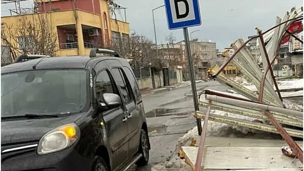 Edinilen bilgilere göre, gün içerisinde etkisini artıran kuvvetli rüzgâr nedeniyle markete ait büyük reklam panosu bulunduğu yerden koparak savruldu.