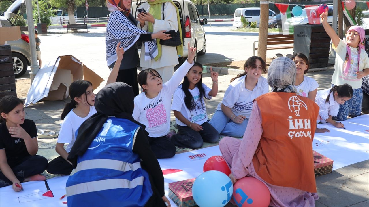 İHH Siirt İnsani Yardım Derneği Yetim Birimince 15 Temmuz Demokrasi Meydanı'nda düzenlenen etkinliğe katılan öğrenciler, İsrail'in Gazze'ye yönelik saldırılarına tepki amacıyla resimler çizdi.