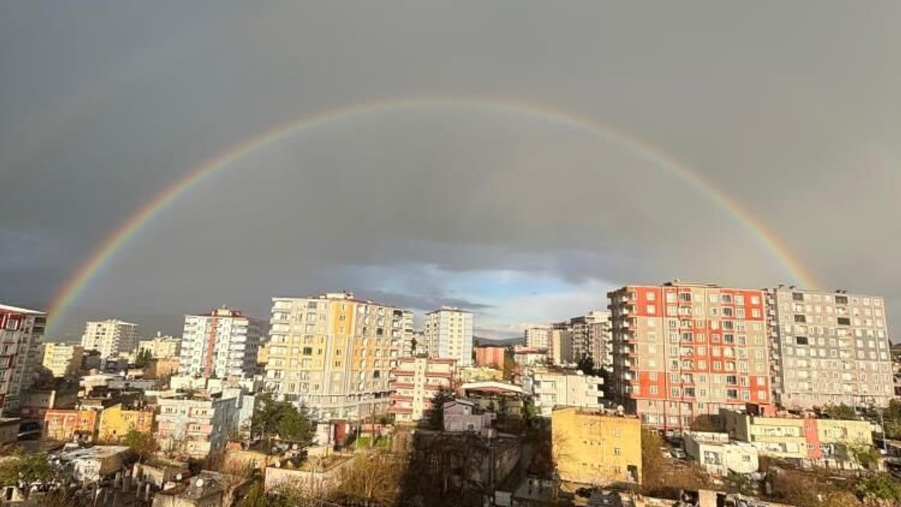 Yağmurun dinmesiyle birlikte ortaya çıkan gökkuşağı, ilçe genelinden net şekilde görülebildi. Renklerin oluşturduğu eşsiz manzara kısa sürede vatandaşların ilgisini çekti.