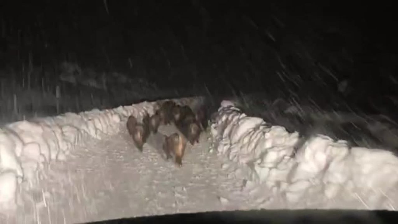 Karlı yol üzerinde koşarak ilerleyen yaban domuzu sürüsü, ekipler tarafından cep telefonu kamerasıyla kaydedildi. Görüntülerde, sürücünün domuzlara “yol verin” diye seslendiği anlar da yer aldı.