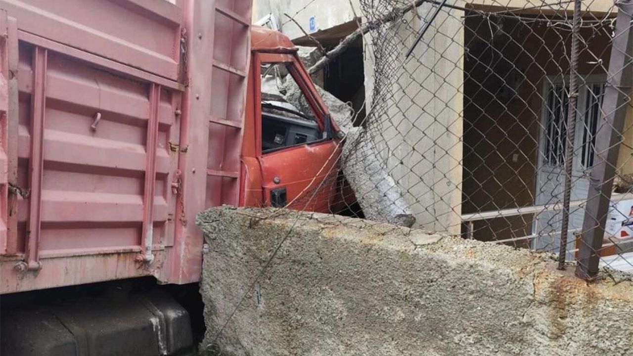 Edinilen bilgilere göre, briket yüklü araç henüz belirlenemeyen bir nedenle sürücüsünün kontrolünden çıktı. Savrulan kamyon, bir konuta ait istinat duvarını aşarak evin içine girdi.