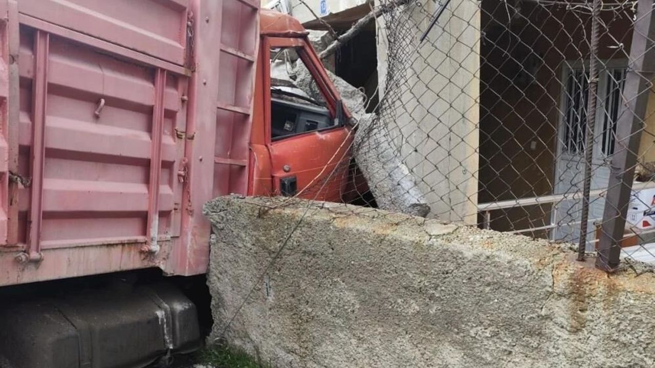 Edinilen bilgilere göre, briket yüklü araç henüz belirlenemeyen bir nedenle sürücüsünün kontrolünden çıktı. Savrulan kamyon, bir konuta ait istinat duvarını aşarak evin içine girdi.