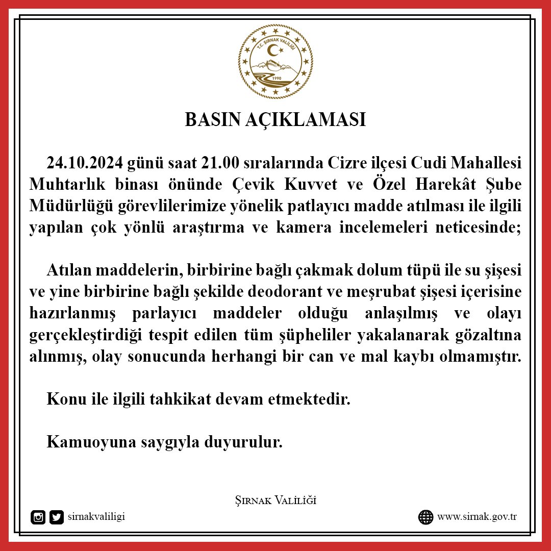 Şırnak Valiliği tarafından yapılan açıklamada, 24 Ekim günü saat 21.00 sıralarında Cizre ilçesi Cudi Mahallesi Muhtarlık binası önünde Çevik Kuvvet ve Özel Harekât Şube Müdürlüğü görevlilerine yönelik patlayıcı madde atılması ile ilgili yapılan çok yönlü araştırma ve kamera incelemeleri neticesinde; atılan maddelerin, birbirine bağlı çakmak dolum tüpü ile su şişesi ve yine birbirine bağlı şekilde deodorant ve meşrubat şişesi içerisine hazırlanmış parlayıcı maddeler olduğu anlaşıldığı ve olayı gerçekleştirdiği tespit edilen tüm şüpheliler yakalanarak gözaltına alındığı ve olay sonucunda herhangi bir can ve mal kaybı olmadığı belirtildi.
