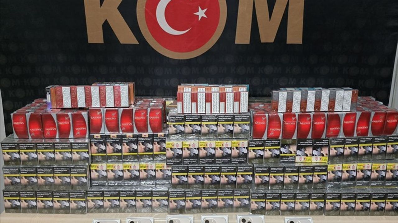 Poşette yapılan aramada gümrük kaçağı 400 karton sigara, 8 karton elektronik sigara ucu ve 9 cep telefonu bulundu.
