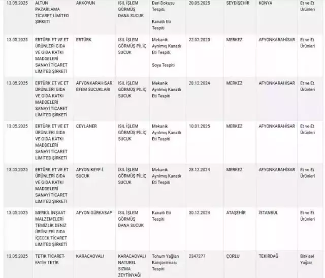 Bakanlığın açıkladığı listede çok sayıda yağ ve süt ürününün yanı sıra, özellikle sucuk üretimi yapan firmalar dikkat çekti.