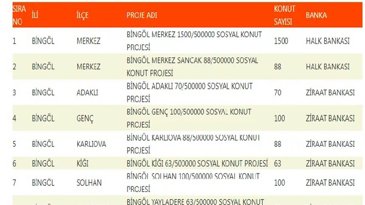 TOKİ’nin açıkladığı listeye göre konut dağılımı şu şekilde: Bingöl Merkez: 1500 konut, Solhan: 100 konut, Genç: 100 konut, Sancak Beldesi: 88 konut, Karlıova: 88 konut, Adaklı: 70 konut, Kiğı: 63 konut, Yayladere: 63 konut.