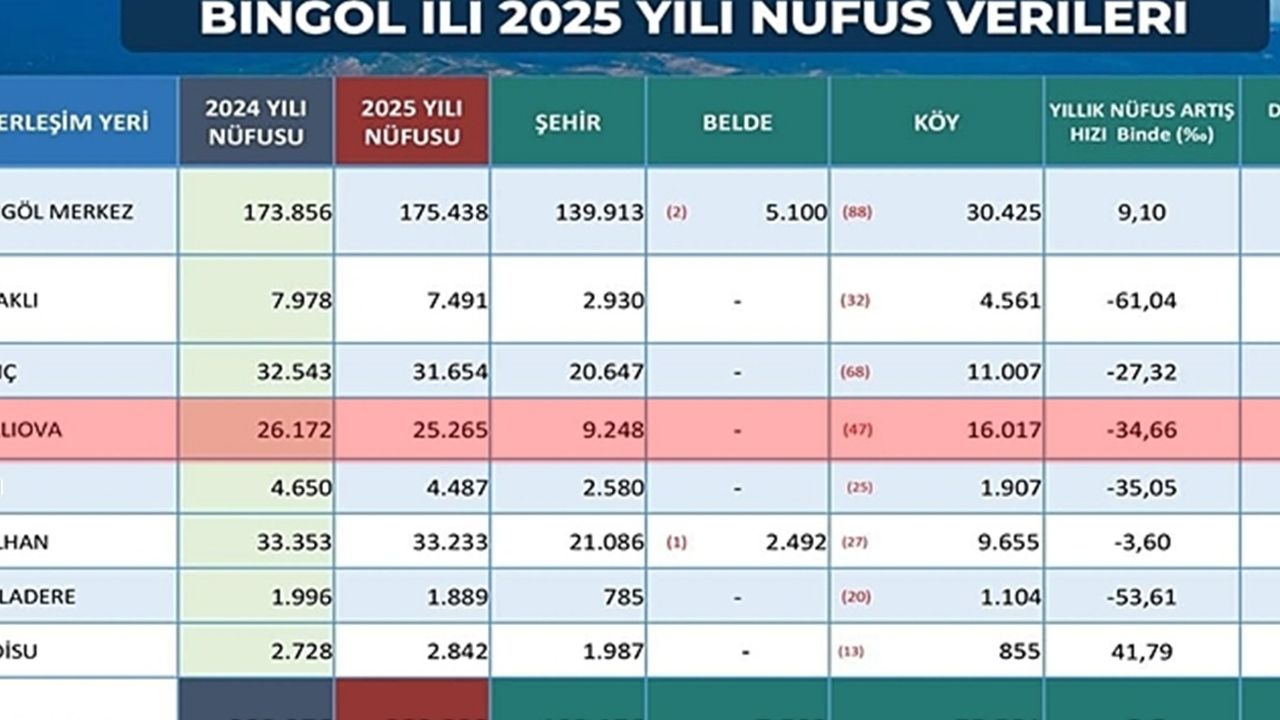 Verilere göre Bingöl’ün toplam nüfusu da 2024 yılına göre 977 kişi gerileyerek 283 bin 276’dan 282 bin 299’a düştü.