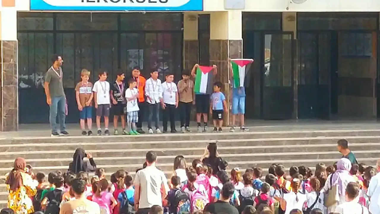 Düzenlenen turnuvayı kazanan çocuklar madalya töreni sırasında Filistin bayrakları açarak Filistin'e destek verdi.