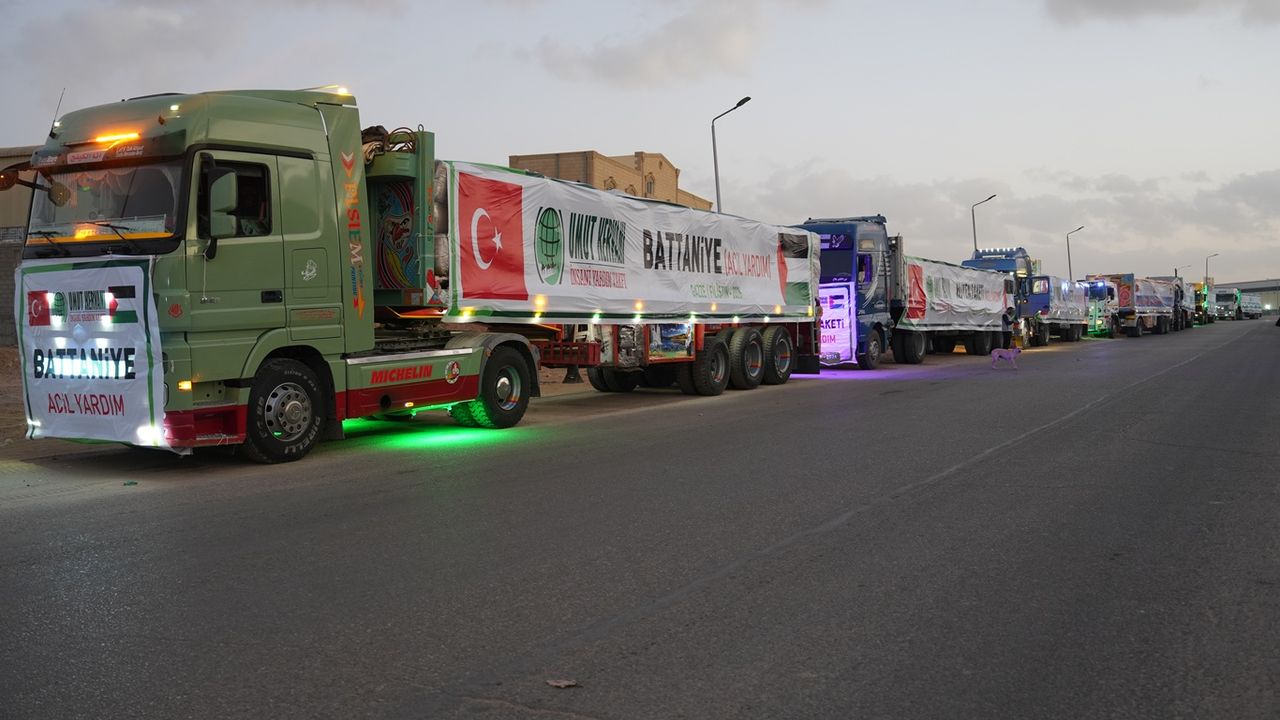 Daha önce de birçok kez Kahire'de hazırladığı yardım tırlarını Refah Sınır Kapısı üzerinden Gazze'ye ulaştıran Umut Kervanı, içerisinde gıda, giyim, hijyen paketi, battaniye gibi temel yaşam malzemelerinin bulunduğu 3 yardım tırını Gazze'ye uğurladı.