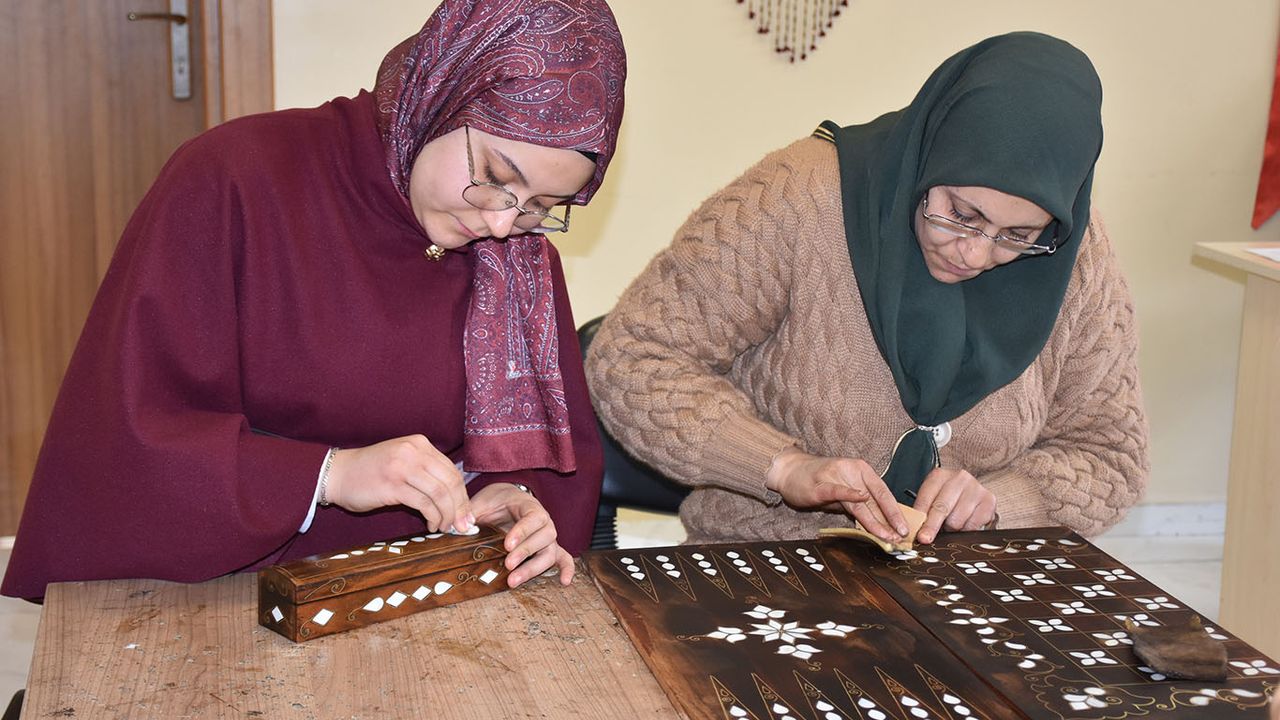Unutulmaya yüz tutmuş sedef kakma sanatını öğrenmek için kursa katılan kadınlar, usta öğretici eşliğinde Selçuklu ve Osmanlı döneminde zirveye ulaşan sedef kakma sanatını öğreniyor.