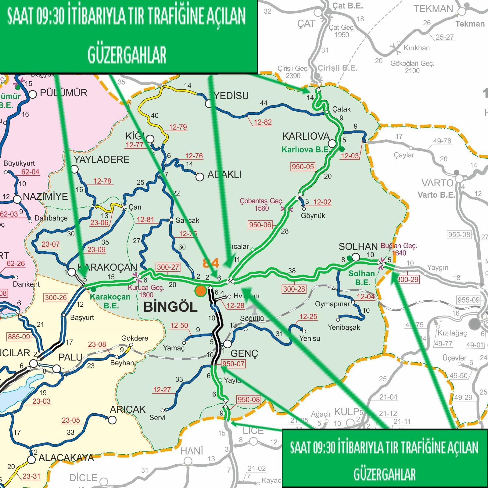 Valilikten yapılan bilgilendirmeye göre, saat 09.30 itibarıyla Bingöl–Erzurum yolunun 0-88’inci kilometreleri, Bingöl–Elazığ yolunun 0-51’inci kilometreleri, Bingöl–Diyarbakır yolunun 0-31’inci kilometreleri ile Bingöl–Muş yolunun 0-61’inci kilometreleri tekrar ulaşıma açıldı.