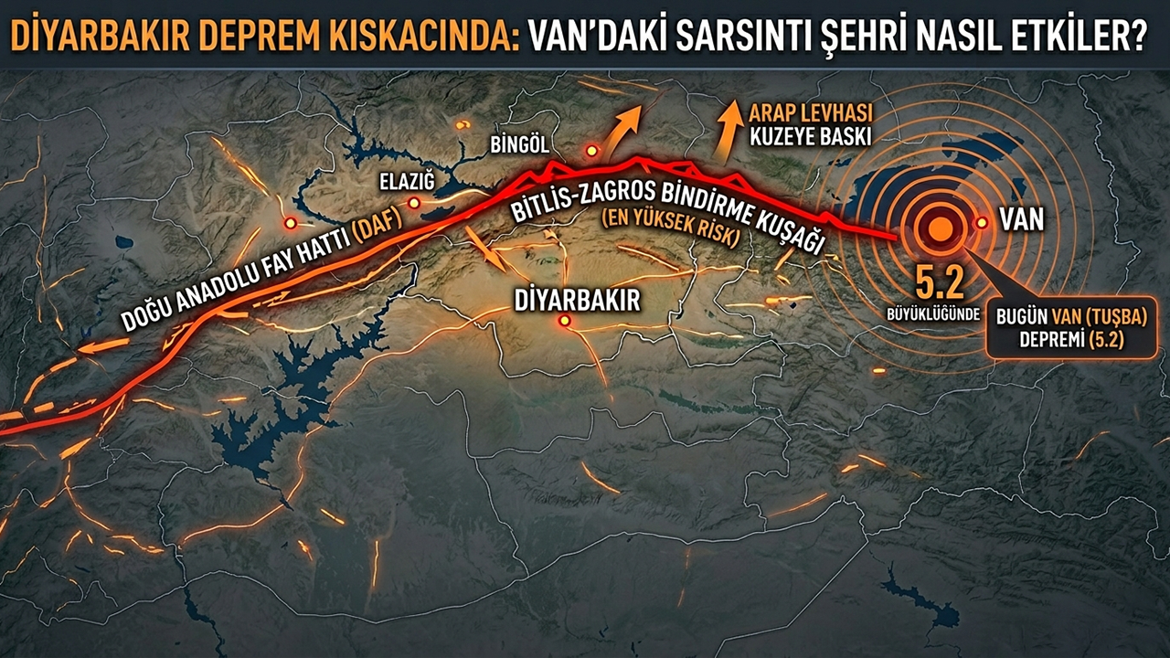 Van'ın Tuşba ilçesinde meydana gelen 5.2 büyüklüğündeki deprem, bölge genelinde geniş bir alanda hissedildi. Teknik verilere göre bu büyüklükteki bir sarsıntı, Diyarbakır'daki fayları doğrudan tetikleyecek bir enerji transferi oluşturmuyor. Ancak Van, Bitlis ve Muş hattındaki bu hareketlilik, Diyarbakır'ın kuzeyini sınırlayan devasa "bindirme kuşağı" üzerindeki genel gerilimin bir parçası.