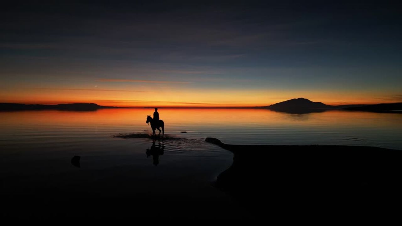 Göl kıyısında atı ile gezintiye çıkan vatandaş gün batımı ile güzel görüntüler oluşturdu.
