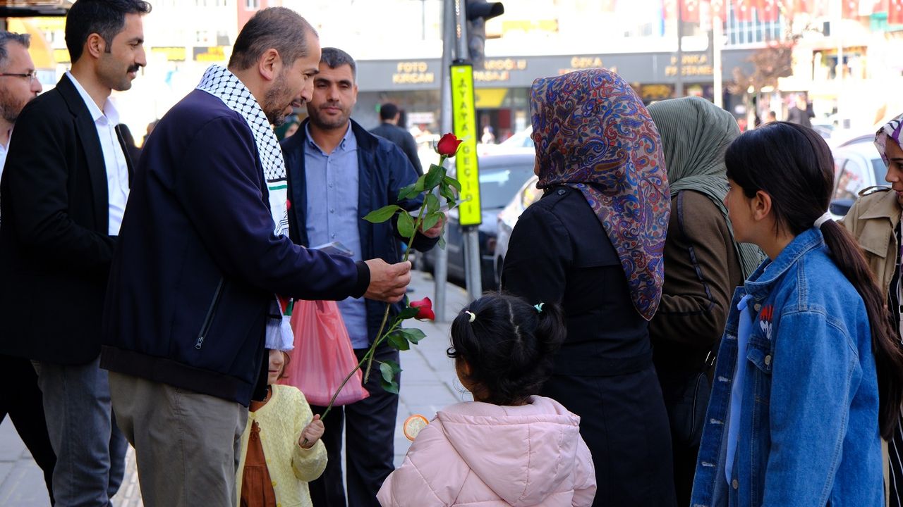 "Direniş Önderi Hazreti Muhammed (sallallahu aleyhi vesellem)" temalı etkinlik öncesinde, vakfın üye ve gönüllüleri kent merkezindeki esnaf ve vatandaşlara gül dağıttı.