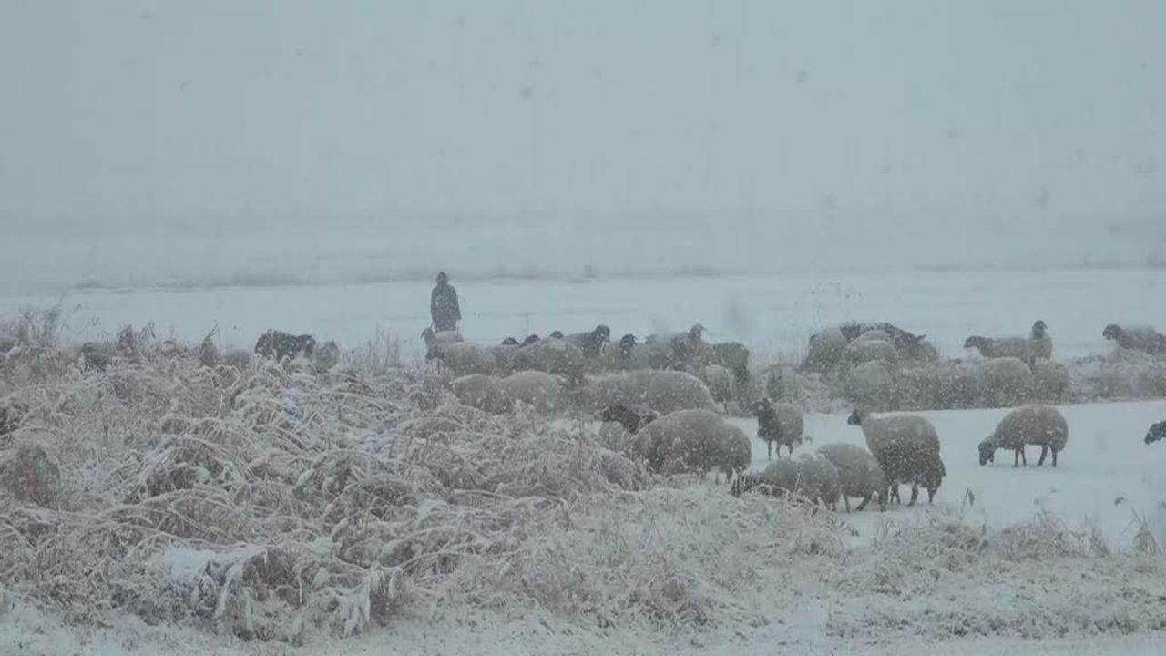 Van’ın Çaldıran İlçesi’nde sabah saatlerinde başlayan ve öğleden sonra etkisini artıran kar yağışı, Çaldıran Ovası ile meralarda yüzlerce küçükbaş hayvanı otlatan çobanlara zor anlar yaşattı.