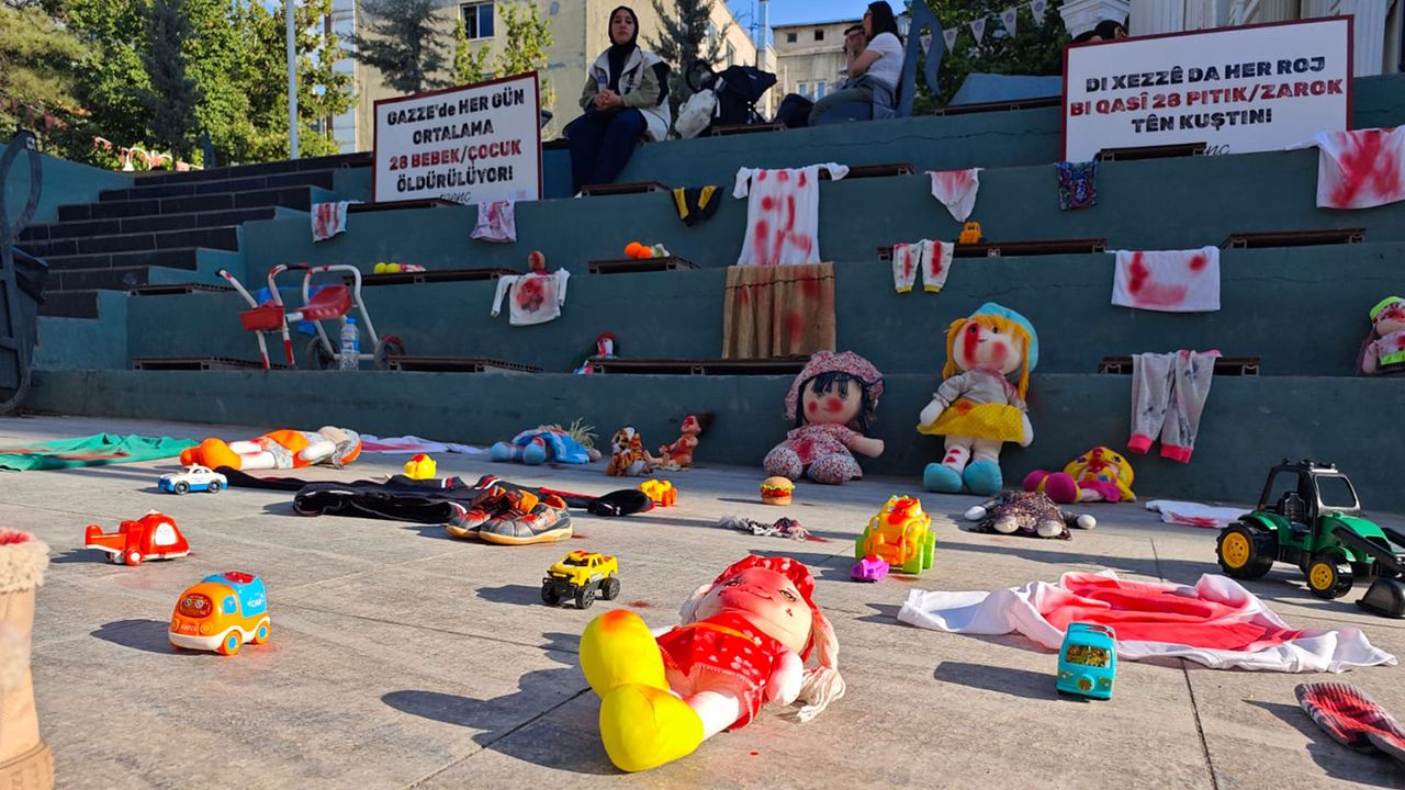Etkinlik kapsamında, merdivenlere kanla boyanmış çocuk ayakkabıları, oyuncaklar, kıyafetler ve kefene sarılmış bebek figürleri yerleştirildi. Hazırlanan bu sembolik yerleştirme, her gün Gazze’de yaşamını yitiren çocukları unutturmamak ve kamuoyunun vicdanını harekete geçirmek amacıyla yapıldı.