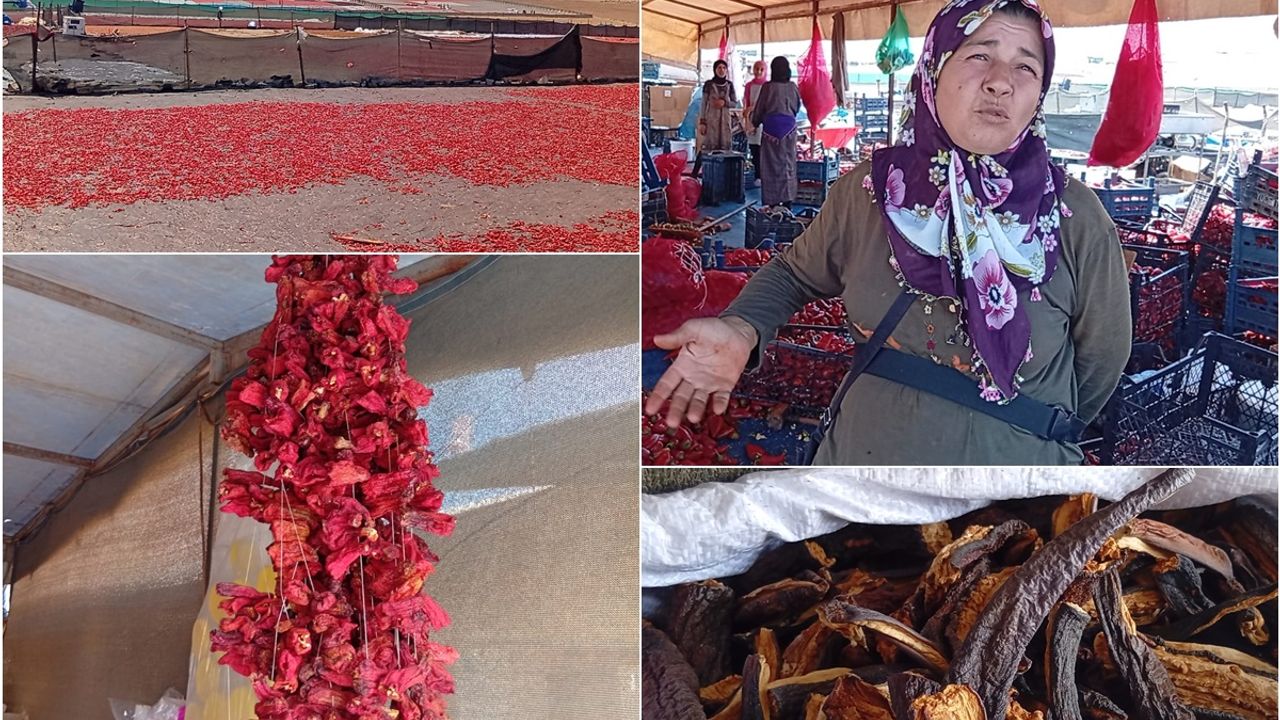 Sıcakta kavrulan toprakta, biber, domates ve patlıcanı tek tek ipe dizen kadınlar, aynı zamanda isot ve pul biber de hazırlıyor.
