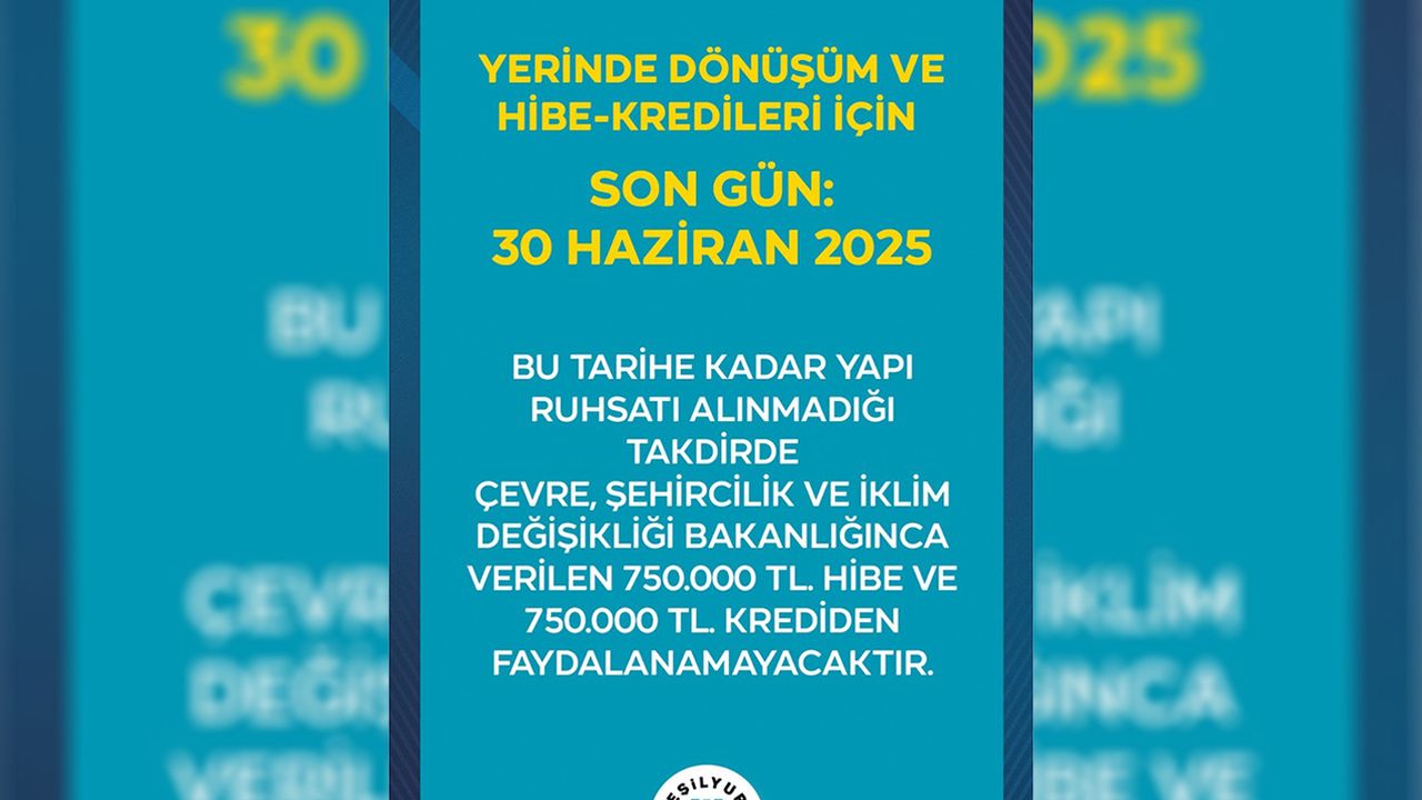 Yeşilyurt Belediyesi İmar ve Şehircilik Müdürlüğü’nden yapılan bilgilendirmeye göre; 30 Haziran 2025 tarihine kadar Yapı Ruhsatı alınmadığı takdirde Çevre, Şehircilik ve İklim Değişikliği Bakanlığınca verilen 750 bin TL hibe ve 750 bin TL kredi hakkından faydalanılamayacağı ifade edildi.